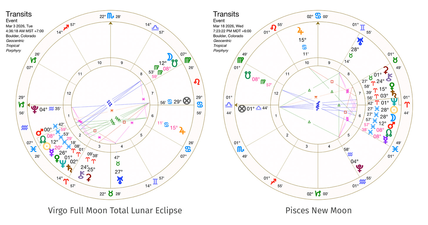 I have already written an essay on the Virgo Full Moon / Total Lunar Eclipse, and will write an upcoming piece on the Pisces New Moon. Of course, we also have Mars going into Pisces, Venus moving into Aries, the Equinox / Astrological New Year, Mercury direct, and more, all of which will be covered in more detail in the members’ section.